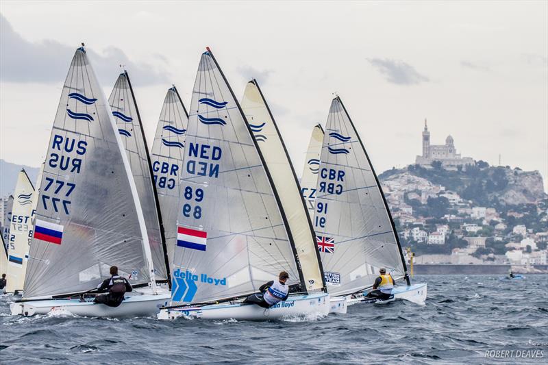 The Bay of Marseille has been a bay of contrasts so far this week with yet another set of new conditions thrown at the competitors on the third day. The sailors are finding the bay both challenging and at times perplexing. Looking forward to a day of moderate to strong winds, the first two races were sailed in a building south-easterly wind with occasional rain, but the third race was abandoned as the wind died completely. The re-sail was eventually sailed in a light and patchy breeze after the Race Committee moved position.