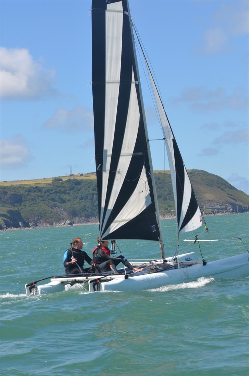 On Saturday we had three handicap races for catamarans and dinghies, with the cruisers from New Quay Yacht Club and Aberaeron racing down to us making a spectacular sight arriving in the bay just as we were starting our first race. Conditions were excellent with force 4 winds and sunshine! Several new members took to the water for their first races, with the two club Dart 16s and club Laser all out on water. Racing was close with a photo finish on race 2 between two F18s and a Dart 16 also finishing at the same time.