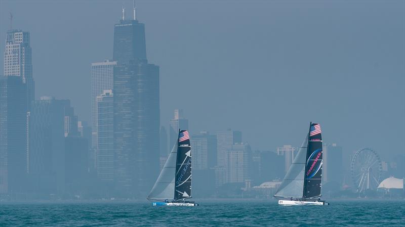 With the Chicago skyline hazed over, light air tactics were on full display for the twelve teams competing in day one of the 2018 M32 World Championship.