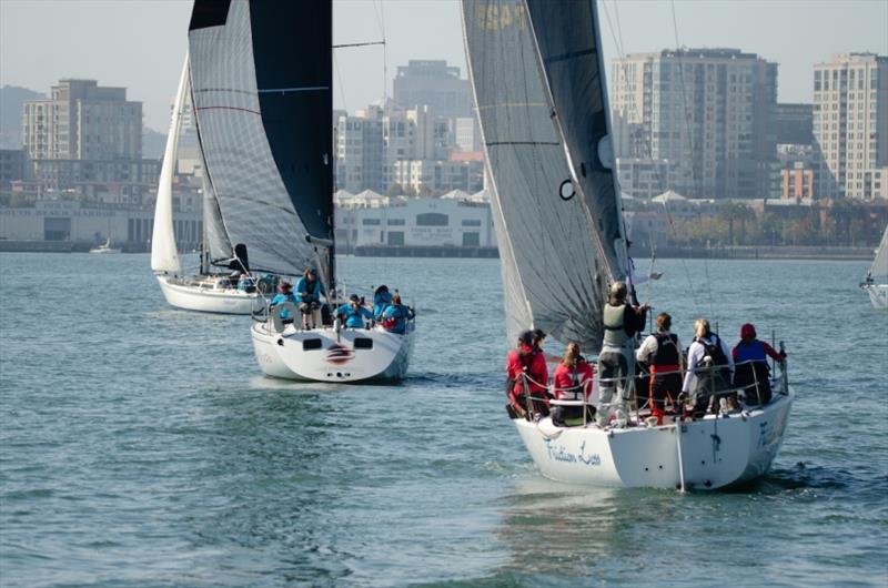 The breeze in October in San Francisco can be temperamental and Saturday, October 20, was no exception. The regatta didn't get under way until 2PM, but it was worth the wait and beautiful to behold. There were fourteen incredibly diverse boats on the starting line, including J/22s, J/30, and J/105s.