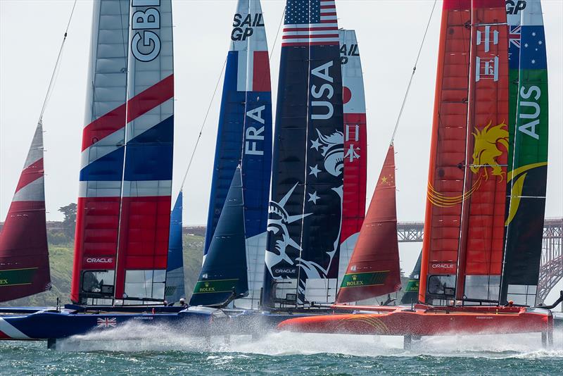 The fleet of six F50s heads for the first mark in race two. Race Day 1 Event 2 Season 1 SailGP event in San Francisco © Chris Cameron
