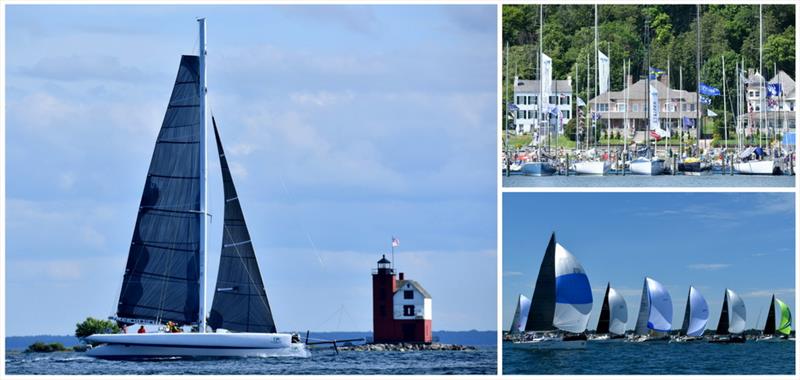 Clockwise from left: Earth Voyager, winner of Division III for Multihulls, at the finish line; Division I winner Stripes at rest with fleet on Mackinac Island; class start on Lake Huron - Bell's Beer Bayview Mackinac Race 2019 © Martin Chumiecki / Bayview Yacht Club