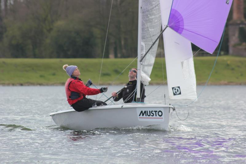 Race one got away with a clean start in a light Easterly breeze, with a short and shifty beat to the first mark. Jonny Coate and Kate Phillips picked up some private breeze on the right which also lifted them to mark on starboard to round in the lead. The battles for places behind allowed Jonny and Kate to sail conservatively and hold their lead for the rest of the race, however a late challenge from Chris White and Ollie Goodhead on the last lap kept them on their toes right to the finish. Samuel Bailey and Finn Morgan took third to claim 1-2-3 for South Staffs.