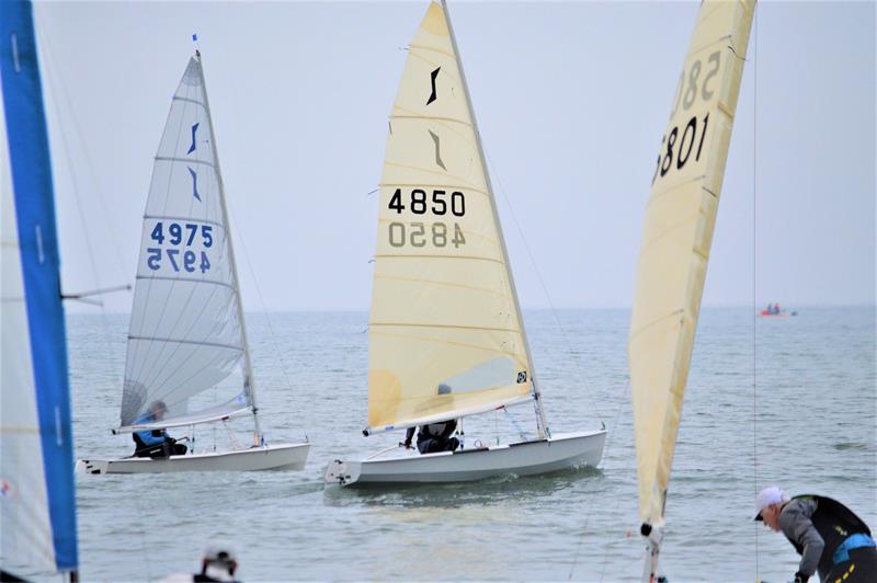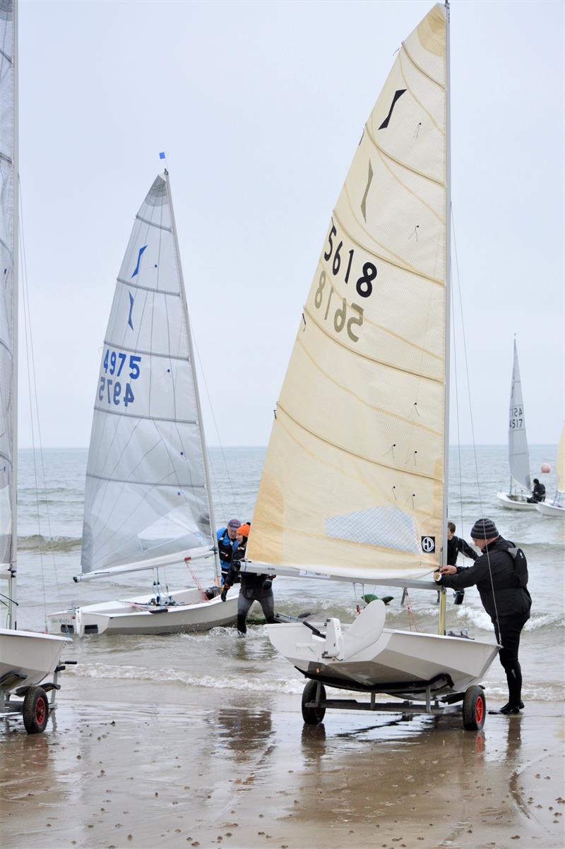 On arrival we found the usual car park already full. Apparently some rare flying visitor from Finland had brought out all the local birdwatchers! It was obvious that we were not going to be able to start at the scheduled 11.00 and the experienced race team led by Pete Malcolm put up an early postponement. This gave the chance for plenty of chat on the beach. It was good to see John Colegrave back after he moved south a few years ago. We also welcomed the youngest member of the fleet, Alexander, who we hope will soon follow his dad Tony King into the fleet. He certainly seemed to enjoy having his toes dipped in the water! There was time to inspect boats and see the best way of rigging a righting line. Dave Parkin had fitted has fitted a flattener to his sail, now allowed by the class, and explained how it worked. Stuart Gibson was presented with a new HD Sails cap to replace the one to replace left in a New York taxi - good to see the sponsors message was being widely spread.