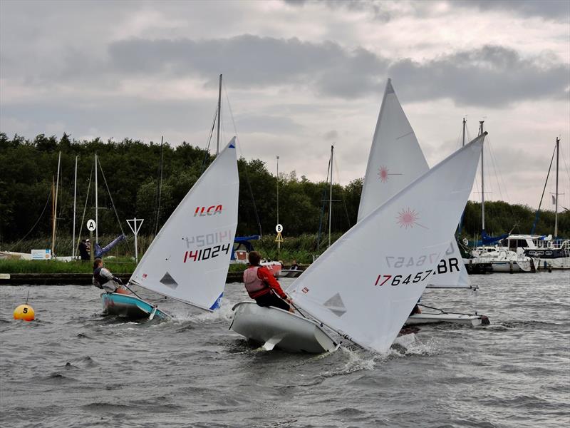 With the forecast for winds to increase during the day, the afternoon was expected to be the most challenging, but it turned out to be the morning, with huge gusts passing through - at one point taking out most of the fleet on the Broad. The more experienced sailors raced on the Broad, mainly in Lasers, RS Fevas, Splashes and faster dinghies, who enjoyed planing up and down, with capsizes a-plenty, forcing several retirements.