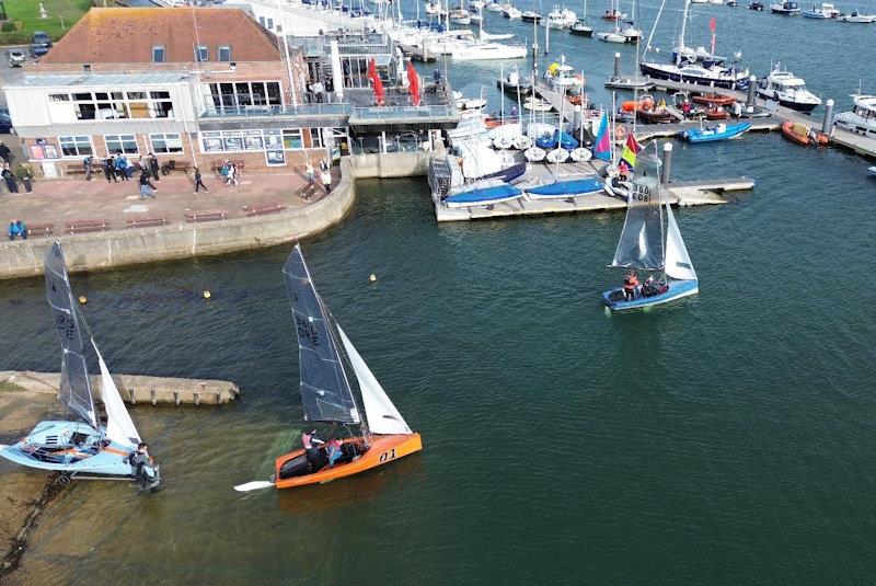 However, it was visitors Ed Chapman/Jam Adam in Gary, Rebecca Videlo/Rob Henderson in Quick Fix and James Wells/Anna Aylward in Point n Squirt who took the early initiative leading for the first couple of laps of a sausage/triangle course in a fresh SE'ly F4. Rebecca/Rob showing blistering downwind pace in the ex-Calvert boat, with Ed/Jam edging the upwind pace. It was only Rebecca/Rob's and Ed/Jam's synchro dismount at the end of lap 2 that let James/Anna to take the lead to the finish gate.