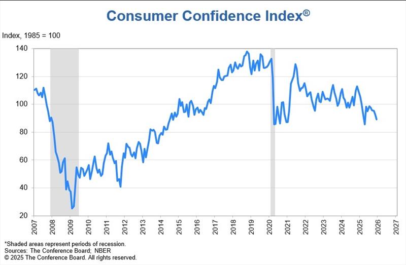 The Consumer Confidence Index declined 3.8 points in December to 89.1, down from an upwardly revised 92.9 in November.